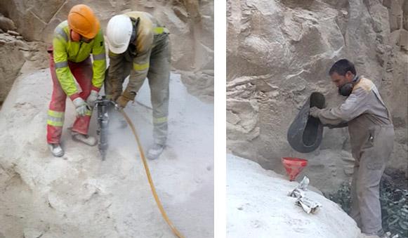 EL CEMENTO EXPANSIVO ROAR se mezcla con agua fría (en verano nunca por encima de 12 grados) y reacciona químicamente provocando una gran tensión expansiva. Más de 8000 TM más que suficiente para demoler cualquier tipo de piedra.